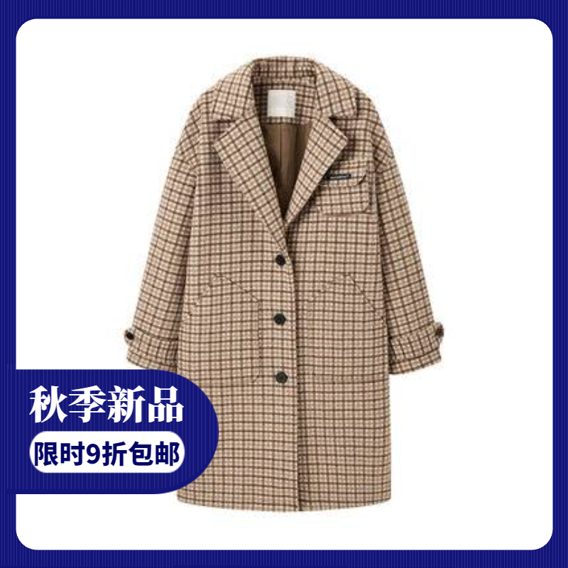 物质女孩格纹大衣女2021年新款春季复古直筒宽松温柔翻领毛呢外套