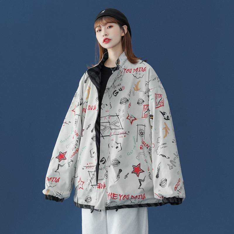 涂鸦外套女韩版宽松两面穿上衣潮ins春秋季复古港味原宿风棒球服