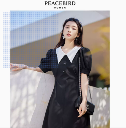 太平鸟黑色法式连衣裙2022夏季新款蝴蝶结收腰撞色翻领气质小黑裙