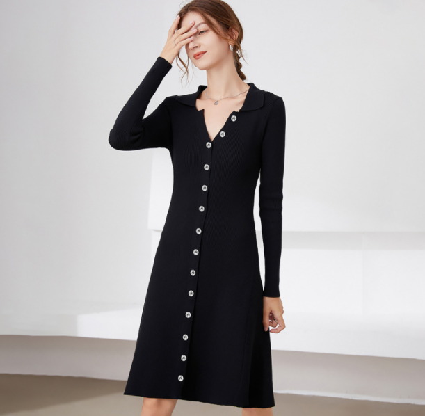 春季新款针织连衣裙POLO领法式毛衣裙a字裙气质通勤女装一件