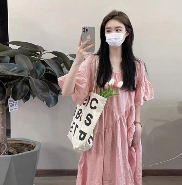 法式复古温柔初恋裙宽松粉色慵懒风连衣裙女夏季港味复古chic裙子