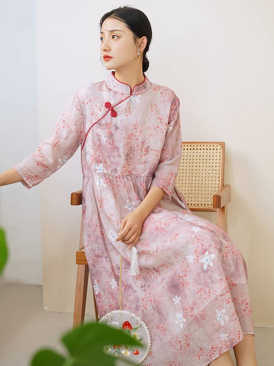 棉麻女装2023春季新款复古连衣裙女收腰显瘦新中式苎麻印花大摆裙