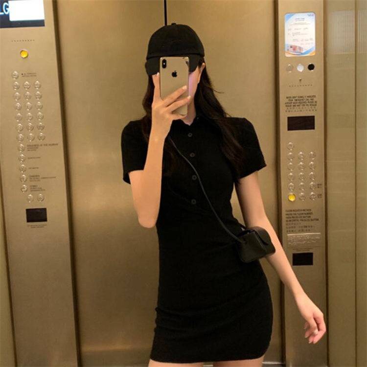 纯欲风修身显瘦褶皱性感甜辣连衣裙子女夏黑色POLO领紧身包臀短裙