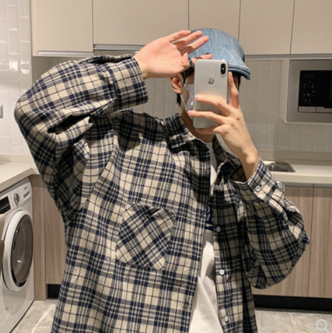2022春秋bf新款休闲男装外套青少年宽松潮流韩版格子衬衫长袖衬衣