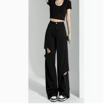 破洞牛仔裤女2022夏薄款直筒宽松高腰显瘦黑色垂感阔腿拖地裤加长