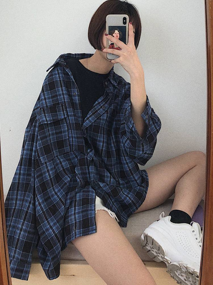 2018新款宽松格子衬衫女秋薄长袖社会衬衣韩版百搭外套