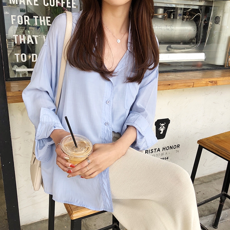 秋季2018新款韩版chic百搭休闲纯色气质宽松单排扣长袖衬上衣女衫