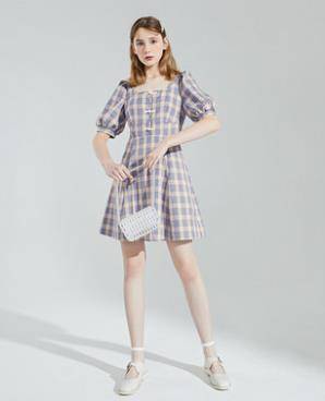 阔色小紫薯复古方领连衣裙2020夏新款韩版复古盘扣格纹裙子女
