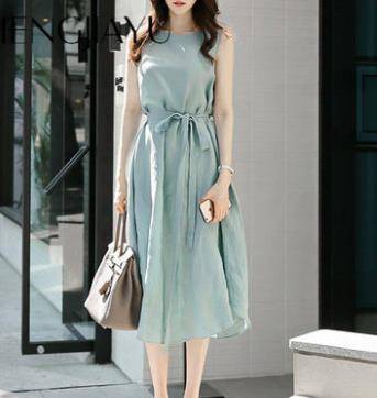 2020夏季新款原宿清新薄荷绿棉麻样无袖连衣裙女不规则长裙女神裙