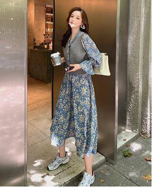 大花媛DHY2020年秋季新款碎花v领收腰气质显瘦喇叭袖长款连衣裙女