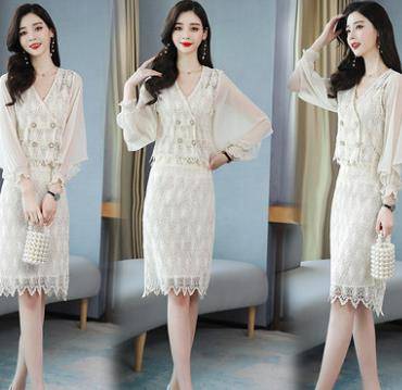 蕾丝连衣裙套装女夏季2020新款雪纺衫两件套洋气包臀一步裙小个子