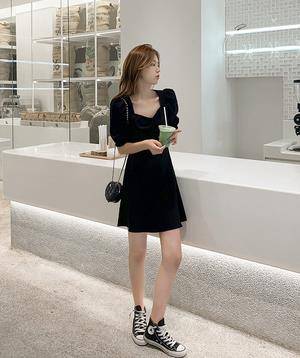 开叉连衣裙女2020新款法式复古宽松显瘦小黑裙方领泡泡袖性感裙子