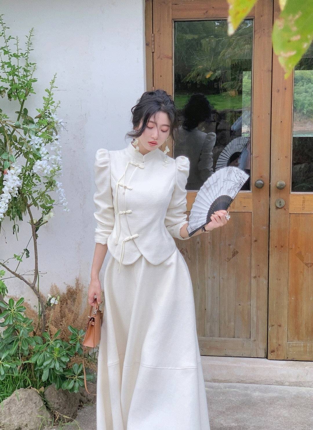 米白色新中式国风盘扣旗袍西装套装小香风连衣裙女装秋装2022新款