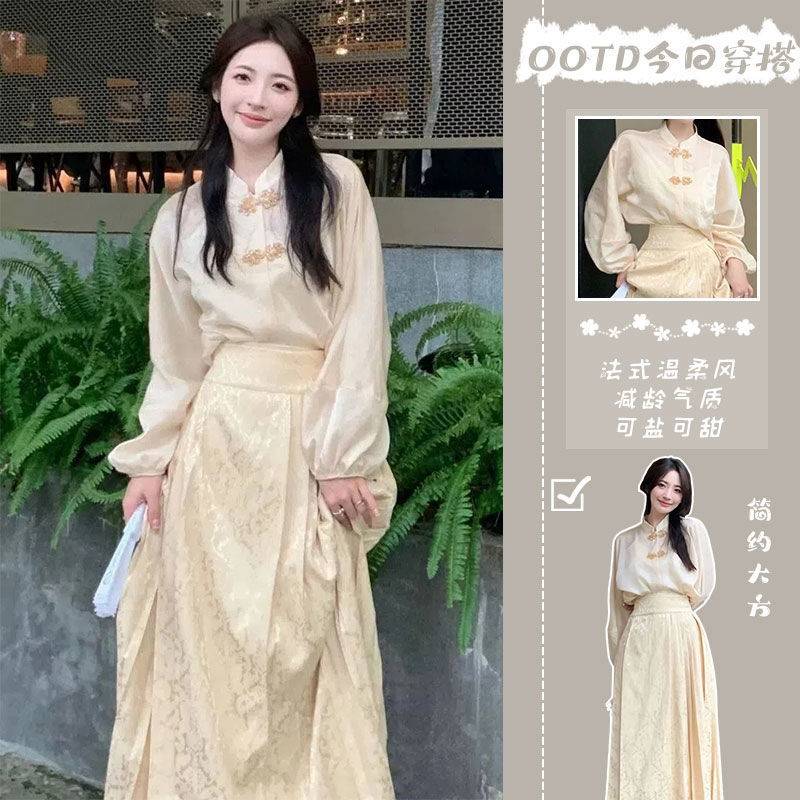古风盘扣衬衫上衣新中式高腰百褶半身裙两件套