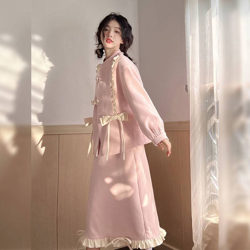 【待绽蔷薇】粉色减龄时尚套装女改良新中式蝴蝶结外套半裙两件套
