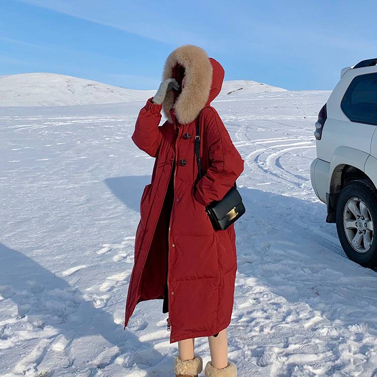2021冬季新款韩版加厚加长款加厚羽绒服女士宽松过膝外套狐狸毛领