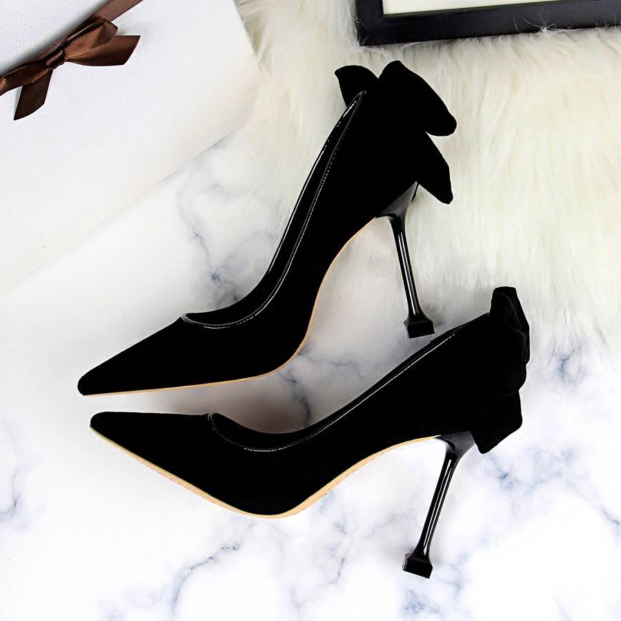 韩版甜美公主蝴蝶结高跟鞋尖头绒面拼色宴会婚鞋成人礼细跟猫跟鞋