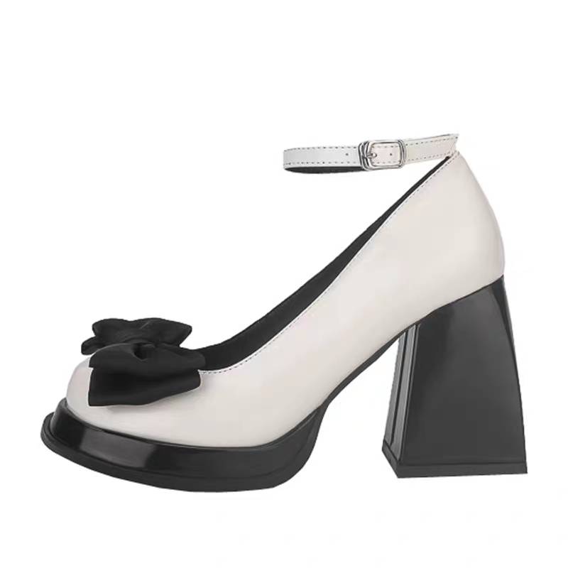 复古厚底白色玛丽珍鞋女圆头2023夏季新款蝴蝶结高跟鞋女粗跟单鞋