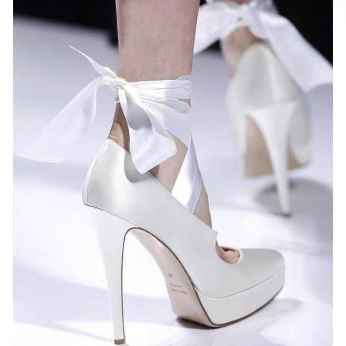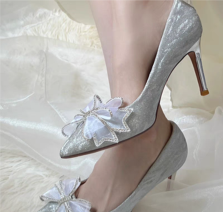 法式水晶鞋2023春秋新款银色婚鞋水钻蝴蝶结尖头高跟鞋女细跟单鞋