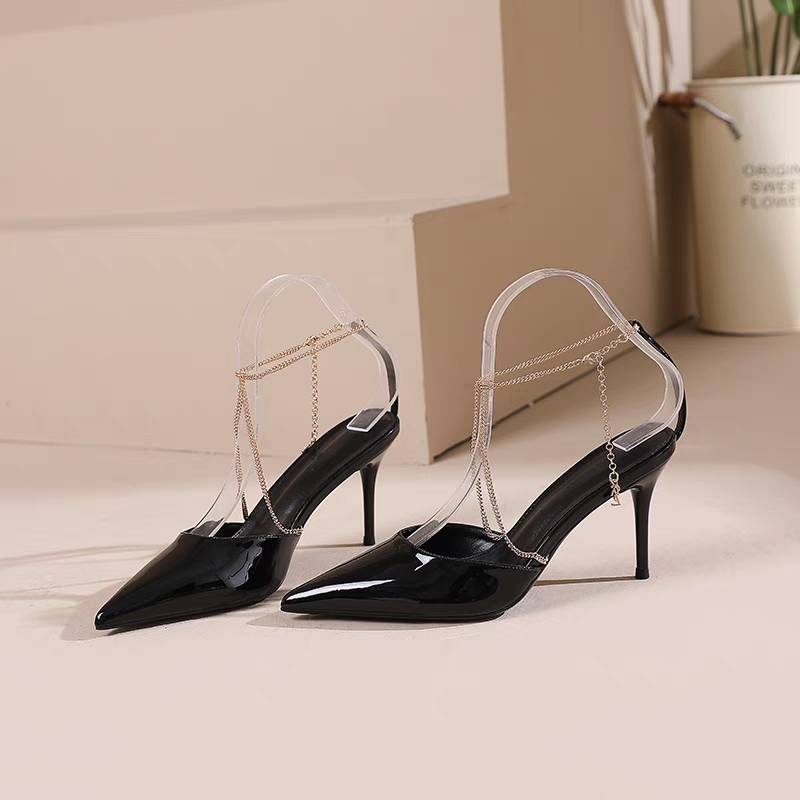 黑色漆皮高跟鞋2023新款设计感小众包头一字带链条斩男细跟单鞋女
