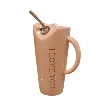 简约大容量陶瓷杯子带吸管勺子喝水杯创意家用办公室咖啡杯
