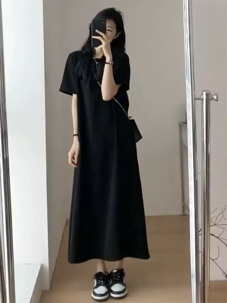 法式茶歇高级感长裙2023年新款女装赫本风黑色Polo连衣裙女夏季