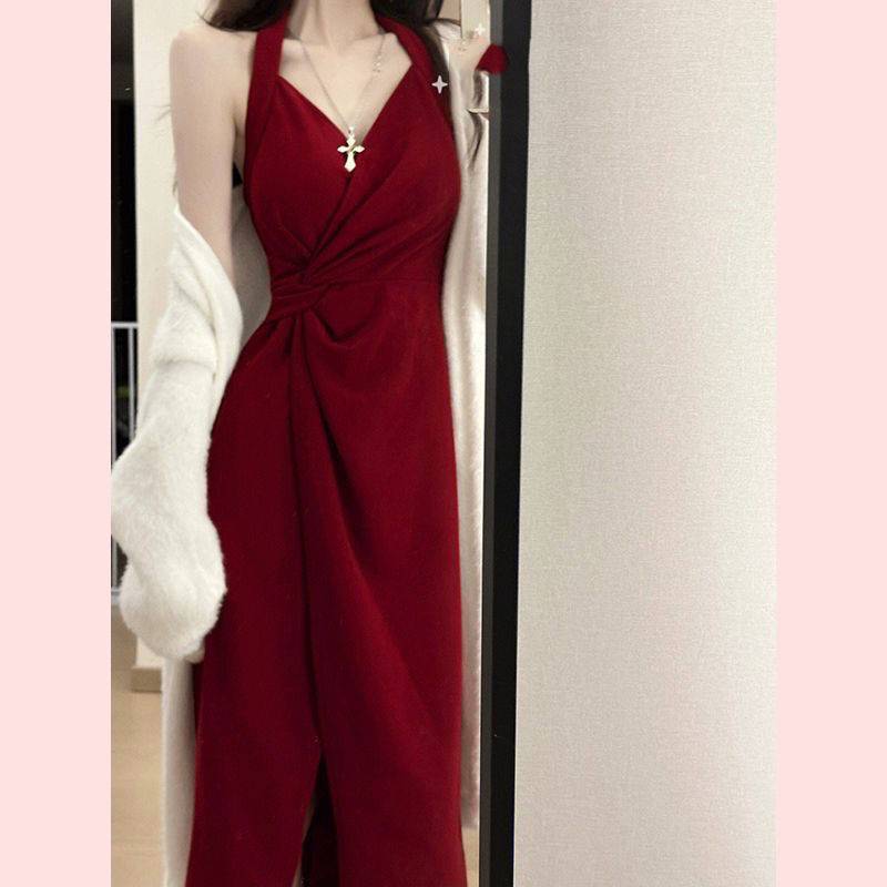 两件套装2022秋冬中长款防羊羔绒外套+高级感法式红色吊带连衣裙