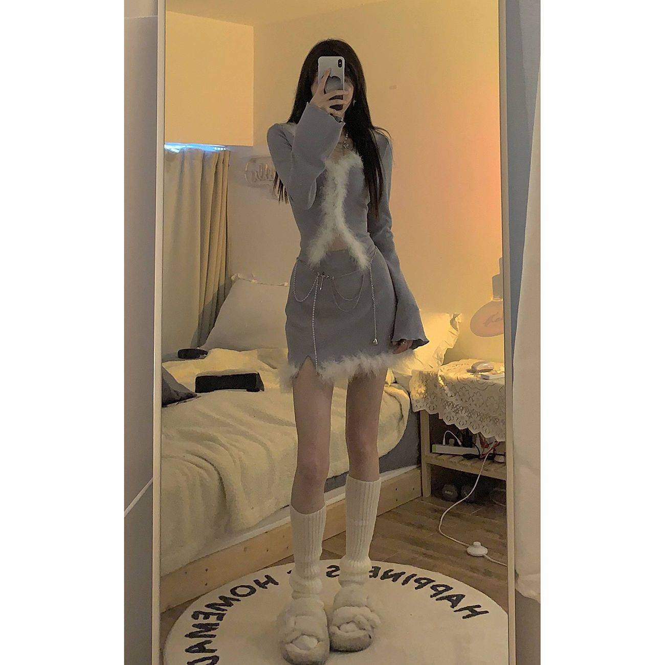 2022新款氛围感软糯套装裙秋季设计感毛边拼接开衫上衣短裙两件套