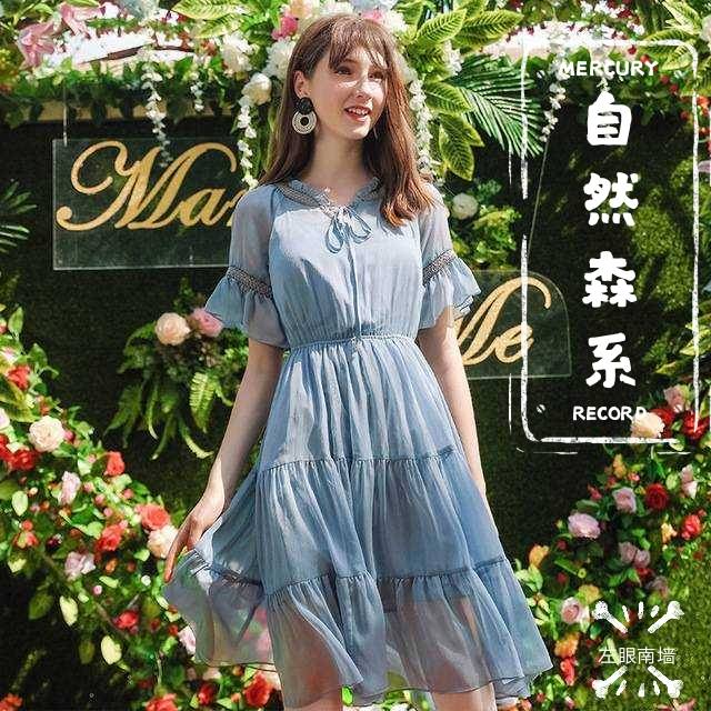 【左眼南墙】2020夏季新款蕾丝雪纺拼接纯色气质复古v领时尚a字连衣裙
