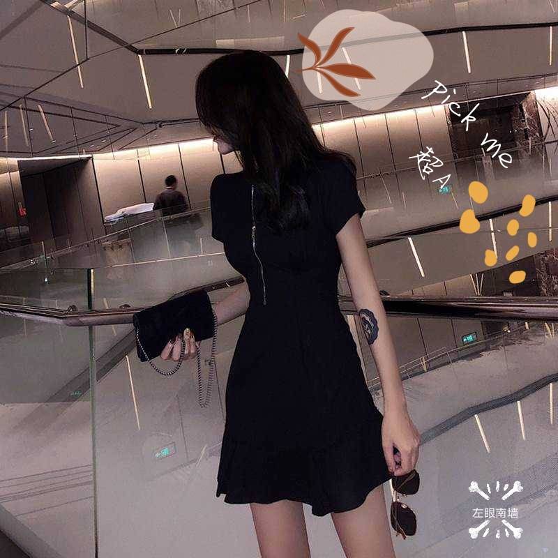 【左眼南墙】2020夏季新款ins风欧美范超A简约小黑裙V领拉链鱼尾连衣裙
