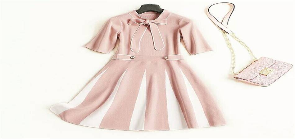 2018初秋新款女装连衣裙立领中袖高腰撞色淑女风针织A字中裙