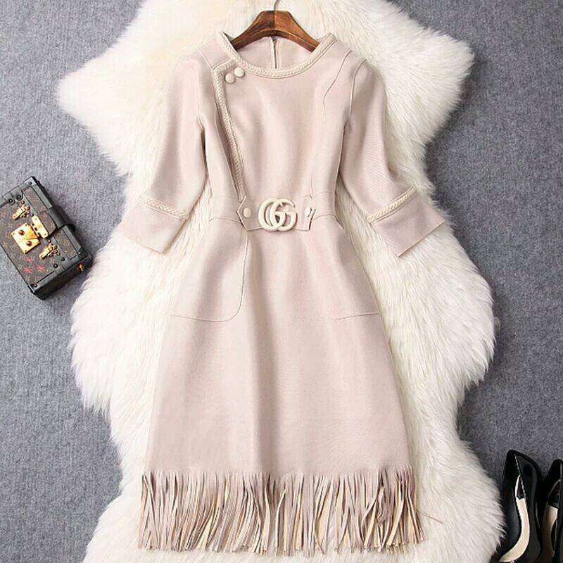 2018早秋新款女装圆领五分袖高腰麂皮绒流苏气质纯色淑女连衣裙