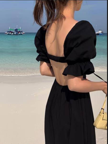 NEVA HU黑色方领泡泡袖露背连衣裙女2023新款修身显瘦气质长裙子
