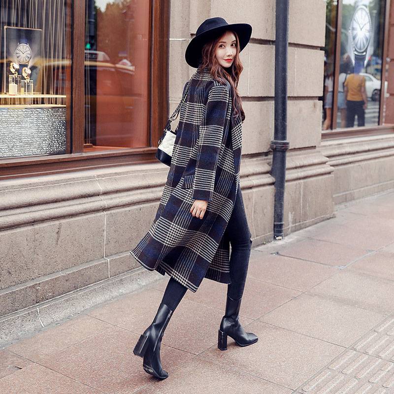 格子风衣女中长款韩版秋装2018新款休闲宽松春秋女装呢子大衣外套