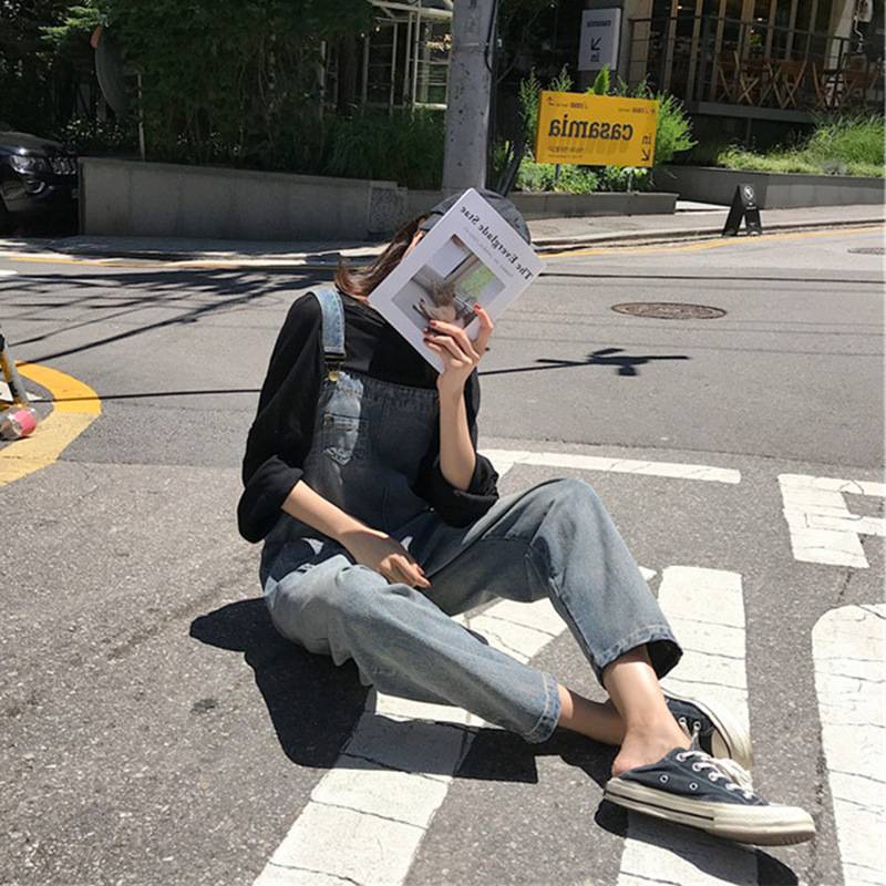 2018秋季新款女装韩版chic港味减龄破洞百搭水洗做旧牛仔背带裤潮