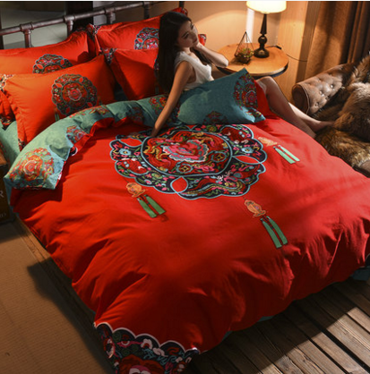 加厚全棉磨毛四件套红色婚庆床品新中式大红被套纯棉结婚床上用品
