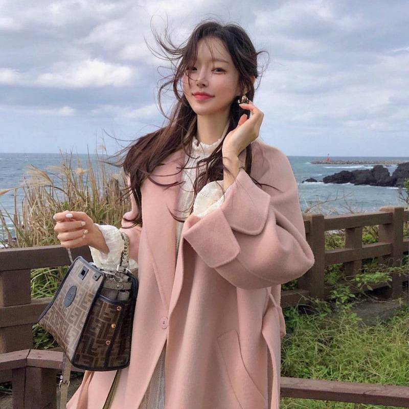 现货 韩国新款长款双面手缝羊绒大衣女双面呢赫本风毛呢外套女