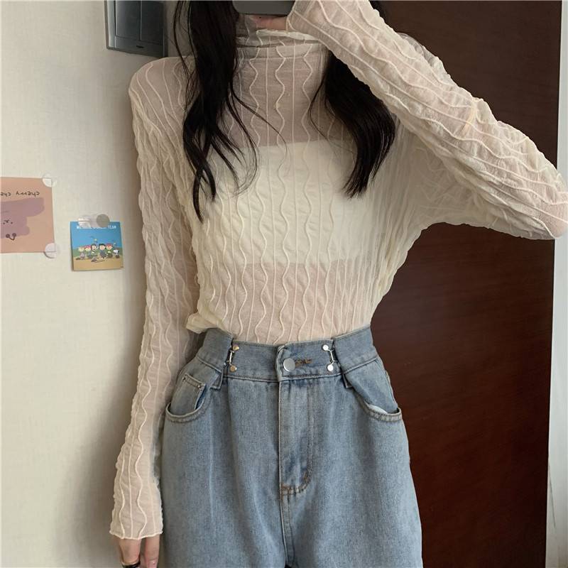 蕾丝打底衫女2023春秋新款内搭半领网纱长袖洋气早春镂空上衣