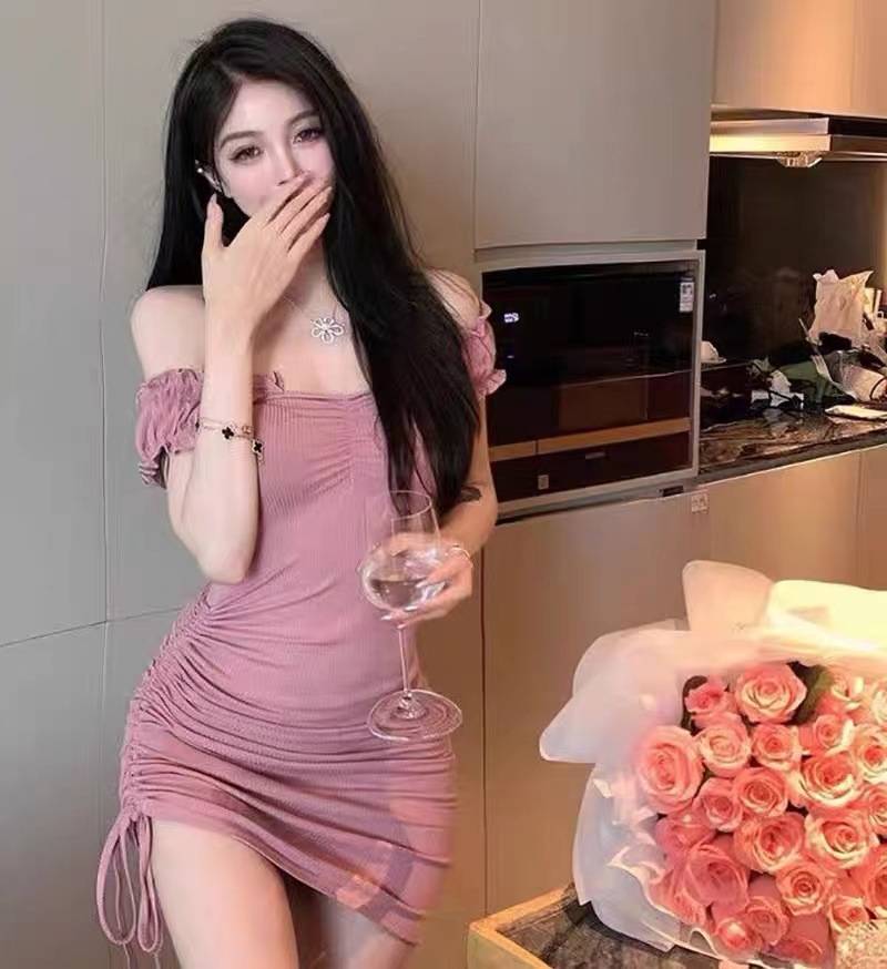 纯欲风一字肩包臀裙女夏新款辣妹甜美抽绳绑带小众收腰显瘦连衣裙