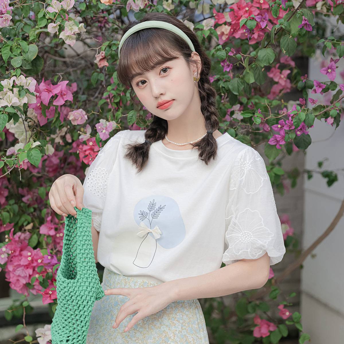 2023夏装新款植物印花T恤简约百搭小清新泡泡袖温柔宽松短袖上衣