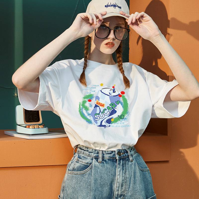 白色纯棉半袖T恤女装2023年夏新款落肩宽松韩版圆领潮牌卡通上衣
