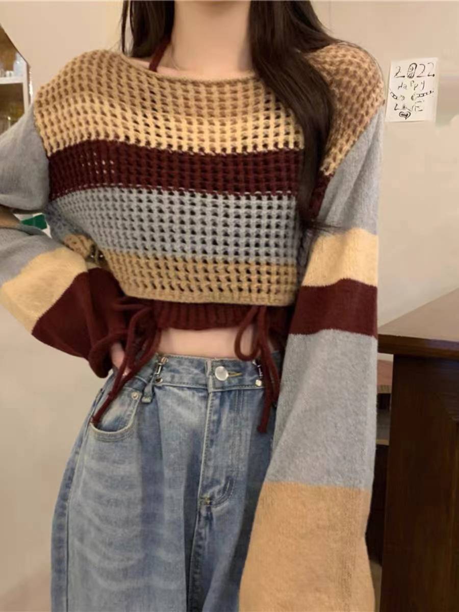 新款韩版早秋镂空针织衫吊带挂脖小众
