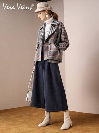 2018秋冬新款女装复古彩色格子羊毛针织呢大衣小个子短款毛呢外套