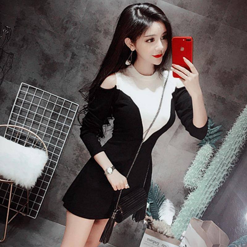 秋冬新款韩版性感漏肩黑白拼色修身显瘦A字连衣裙女长袖针织裙子