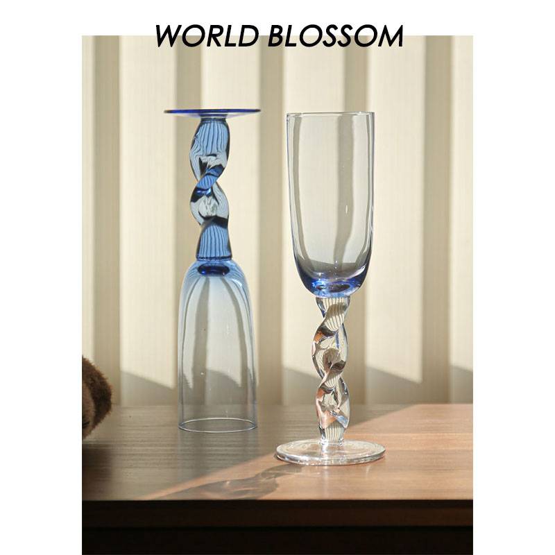 人间开花克莱因蓝扭扭中古高脚杯手工吹制异形复古鸡尾酒杯