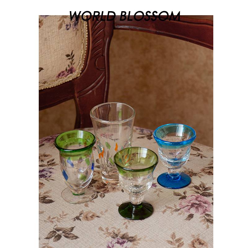 人间开花出口日式彩色印花中古手工吹制水晶玻璃杯酒杯复古mini