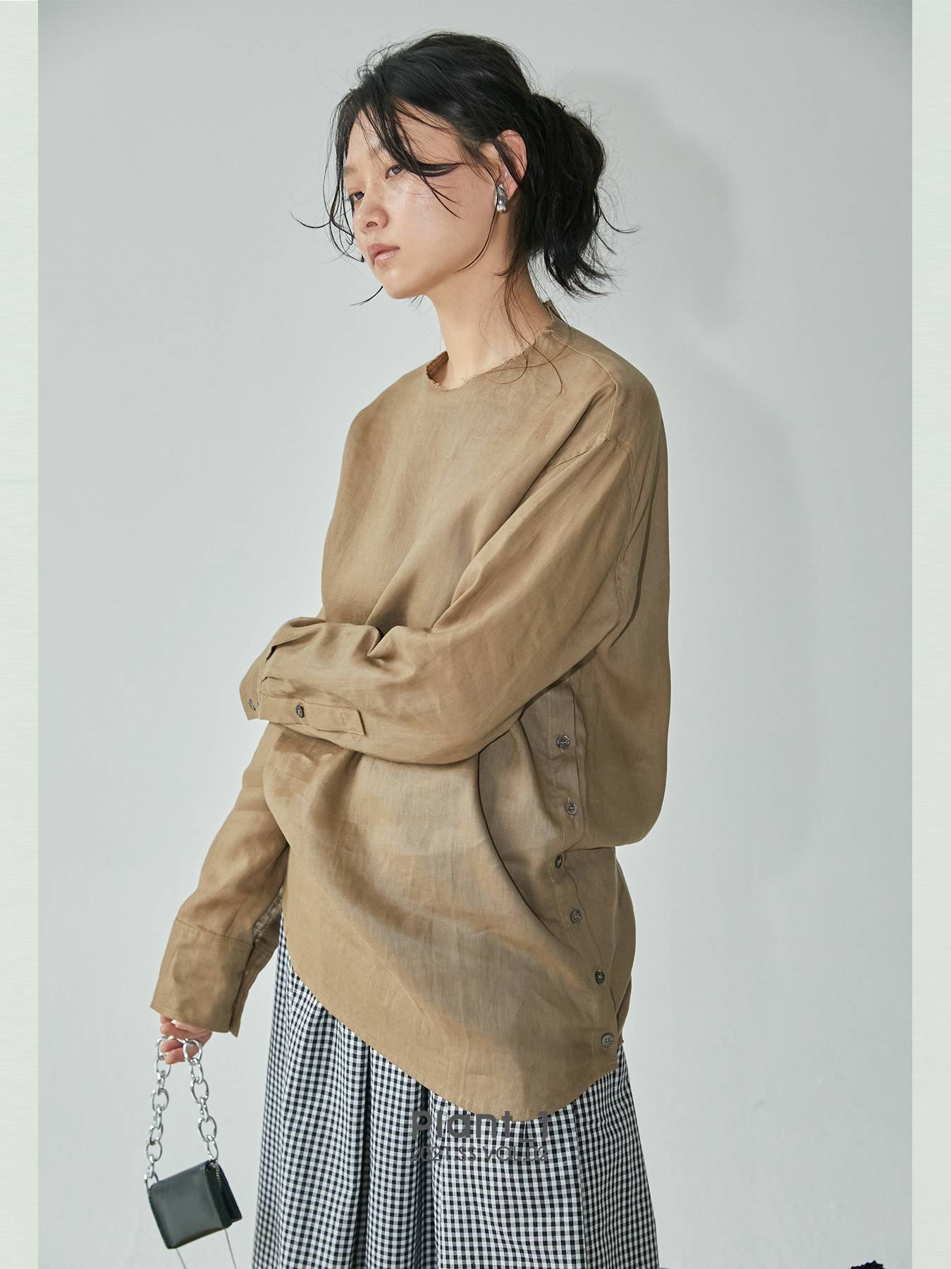 Plant121新款大地色绵麻日系慵懒宽松森女圆领毛边纽扣衬衫上衣