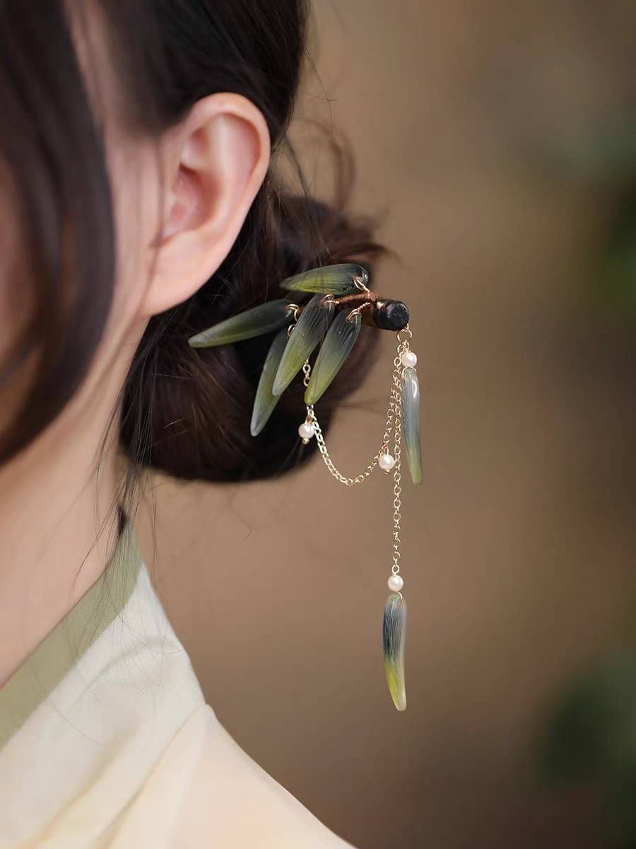 竹节木簪 原创水墨油绿色竹叶簪子女古风 后脑勺盘发发簪新中式