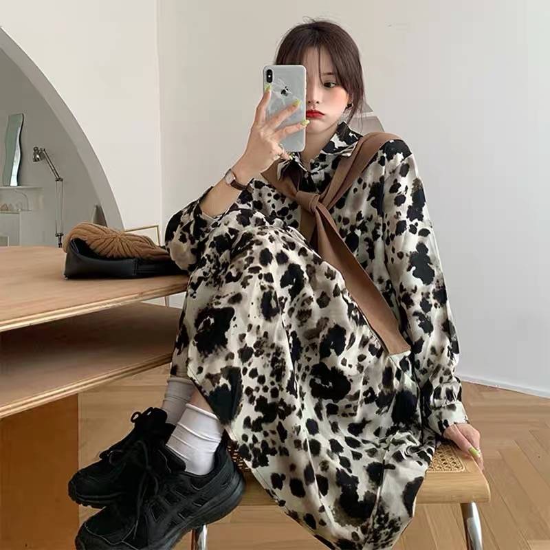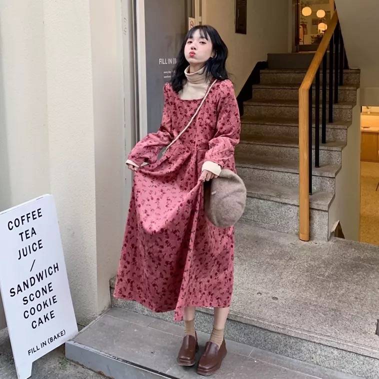 短t少女碎花方领长袖灯芯绒连衣裙女秋装新款长款裙子