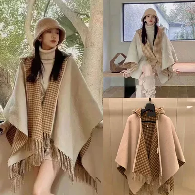 23羊毛羊绒连帽斗篷加厚保暖披肩高端百搭旅行毛呢外套女毯子围巾